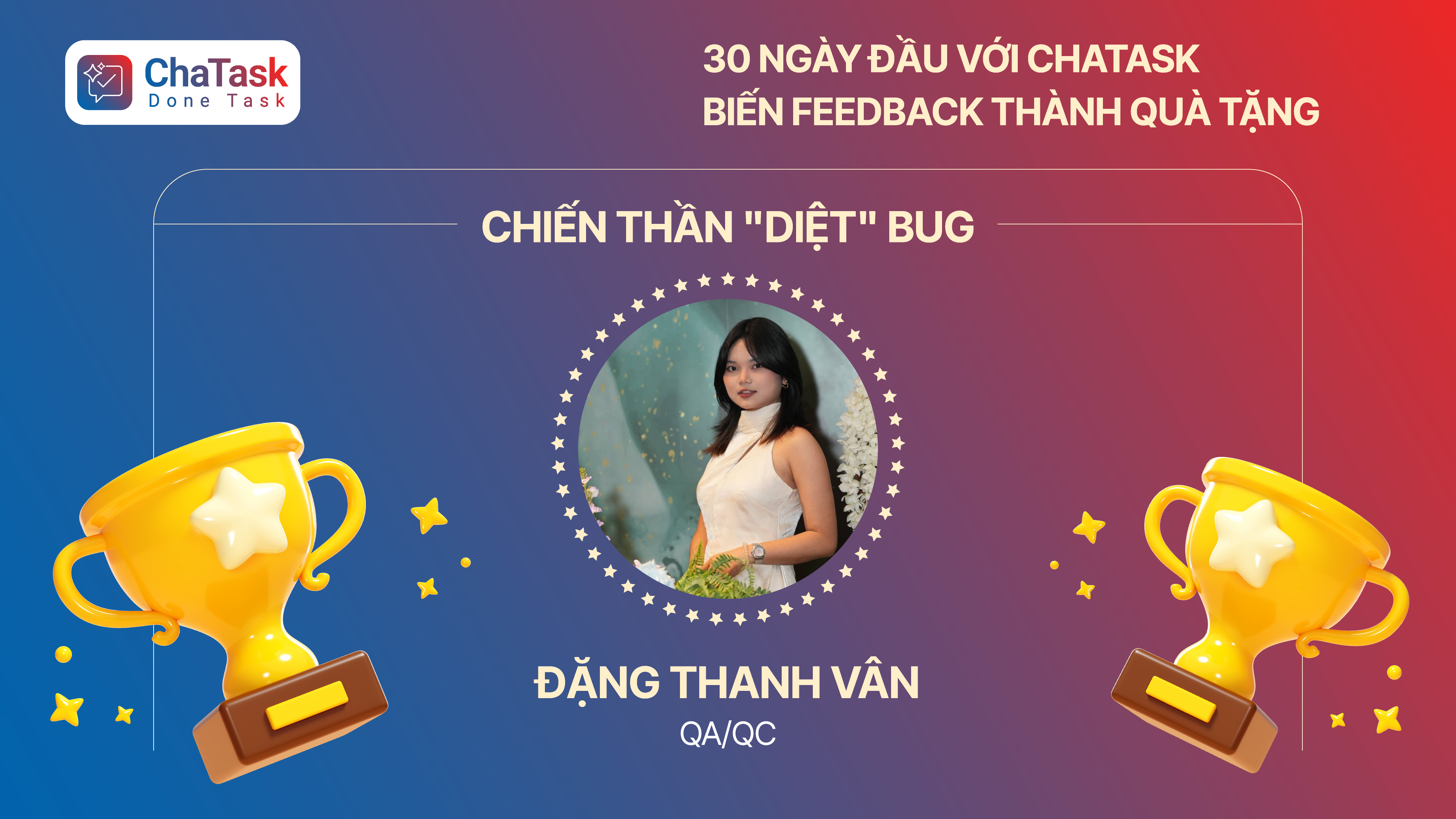 Giải Chiến thần diệt “bug”- Đặng Thanh Vân (QA/QC): Với những báo cáo lỗi thực tế và tâm huyết đã giúp team sản phẩm nhận diện nhanh các vấn đề hệ thống để nâng cấp kịp thời.