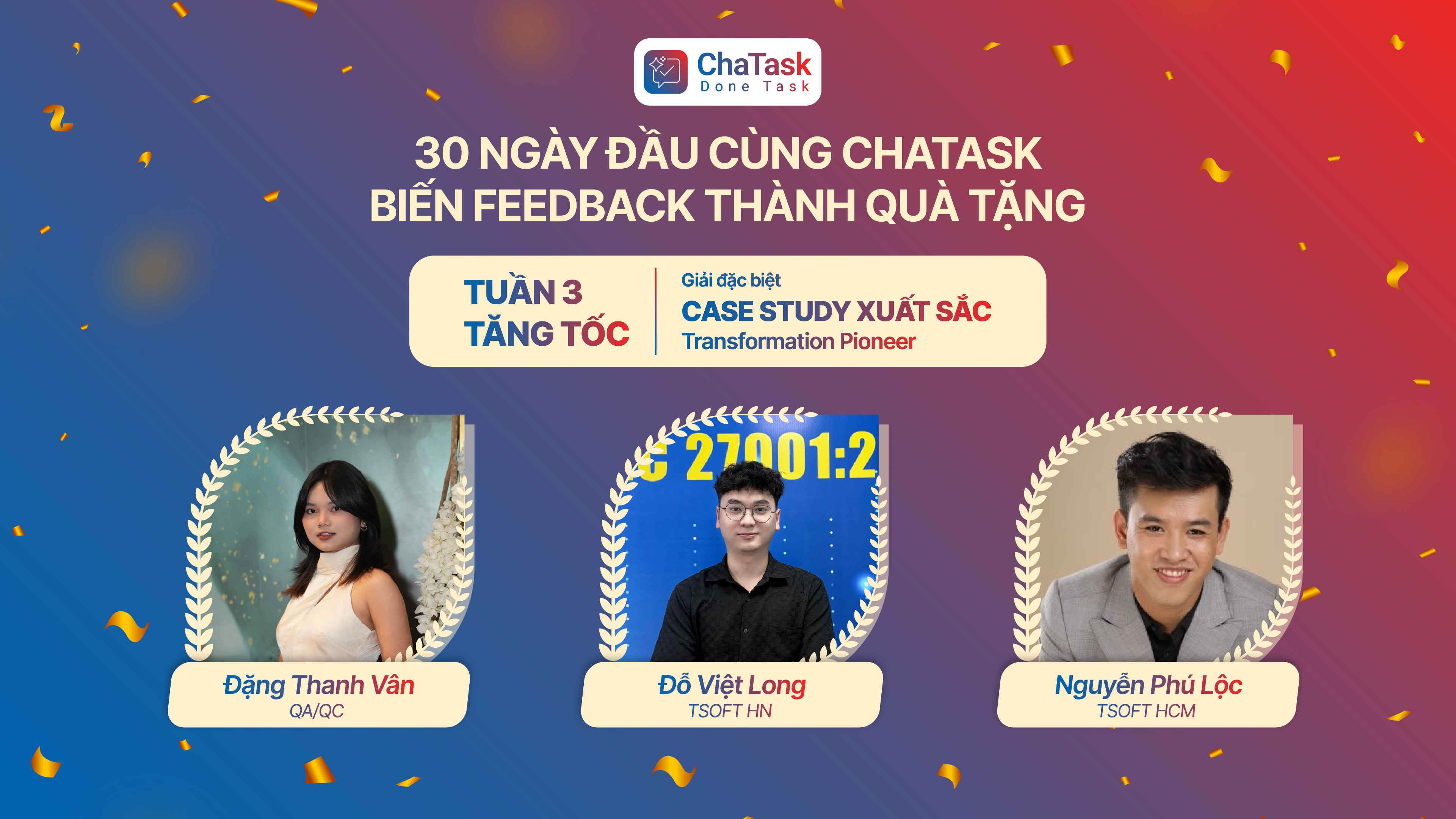 Sự tham gia chủ động của toàn thể CBNS đã cung cấp nguồn dữ liệu thực tế quý giá, giúp đội ngũ phát triển sản phẩm kịp thời tinh chỉnh tính năng và hoàn thiện hệ sinh thái ChaTask. Qua quá trình đánh giá kỹ lưỡng dựa trên tính thực tiễn và chiều sâu của các báo cáo, Ban Tổ chức và hội đồng đánh giá trân trọng vinh danh các cá nhân và tập thể xuất sắc nhất tuần 03: